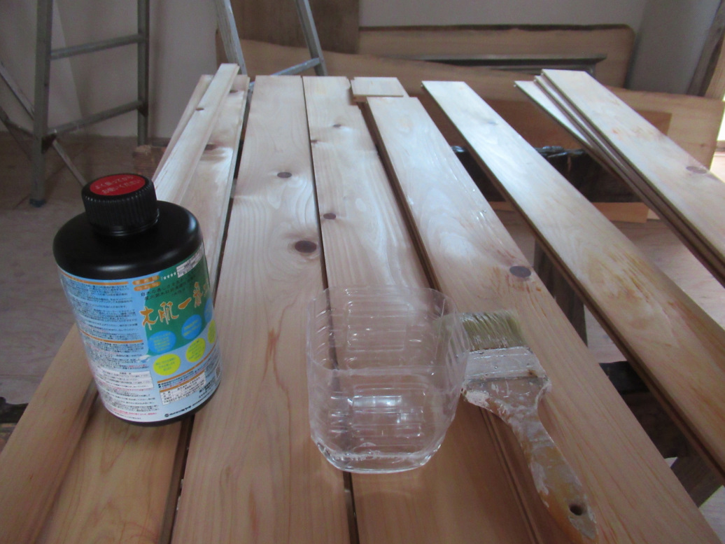 ヒノキ材を大まかにカットして両面に二度塗り。