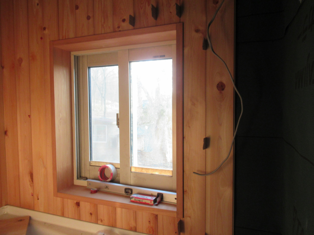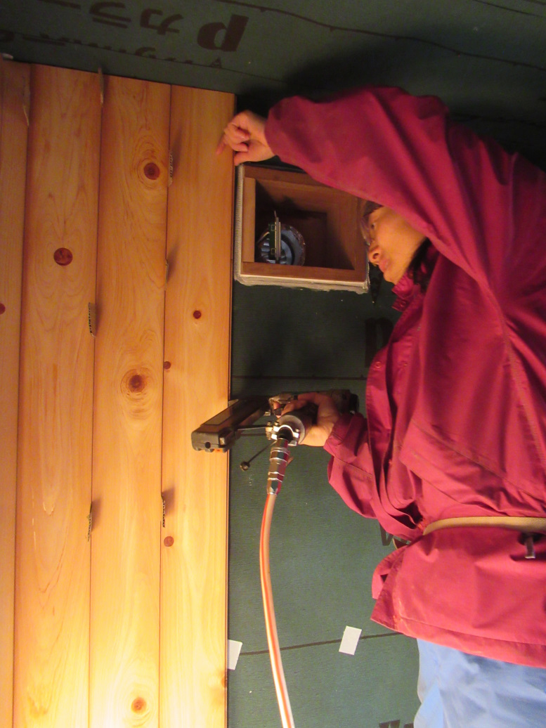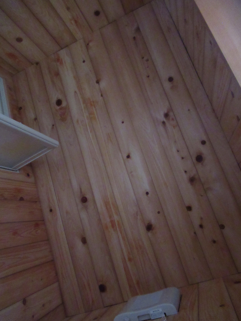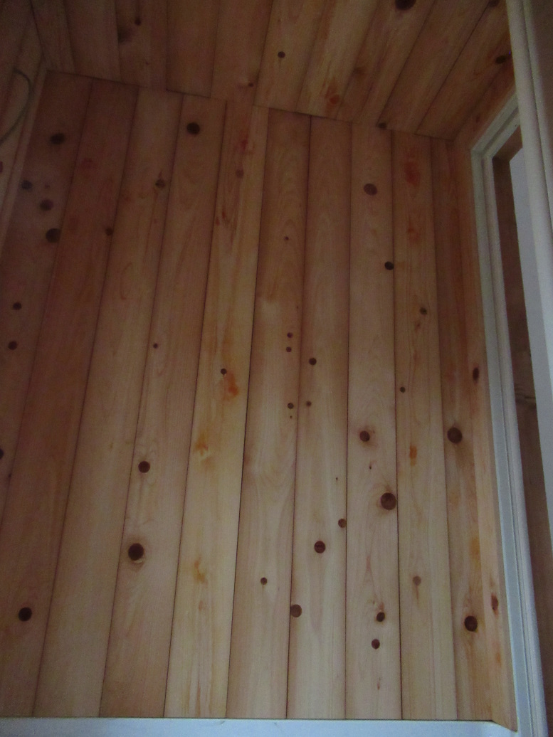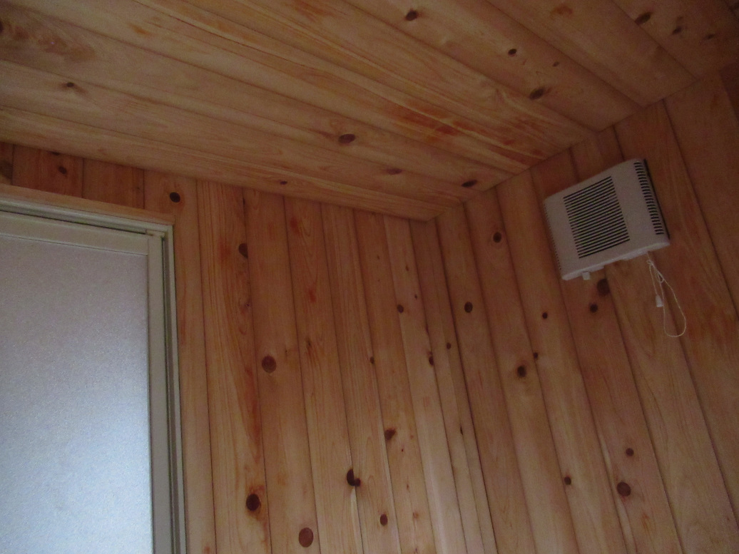 壁の上部と天井に、ヒノキの羽目板を張りました。