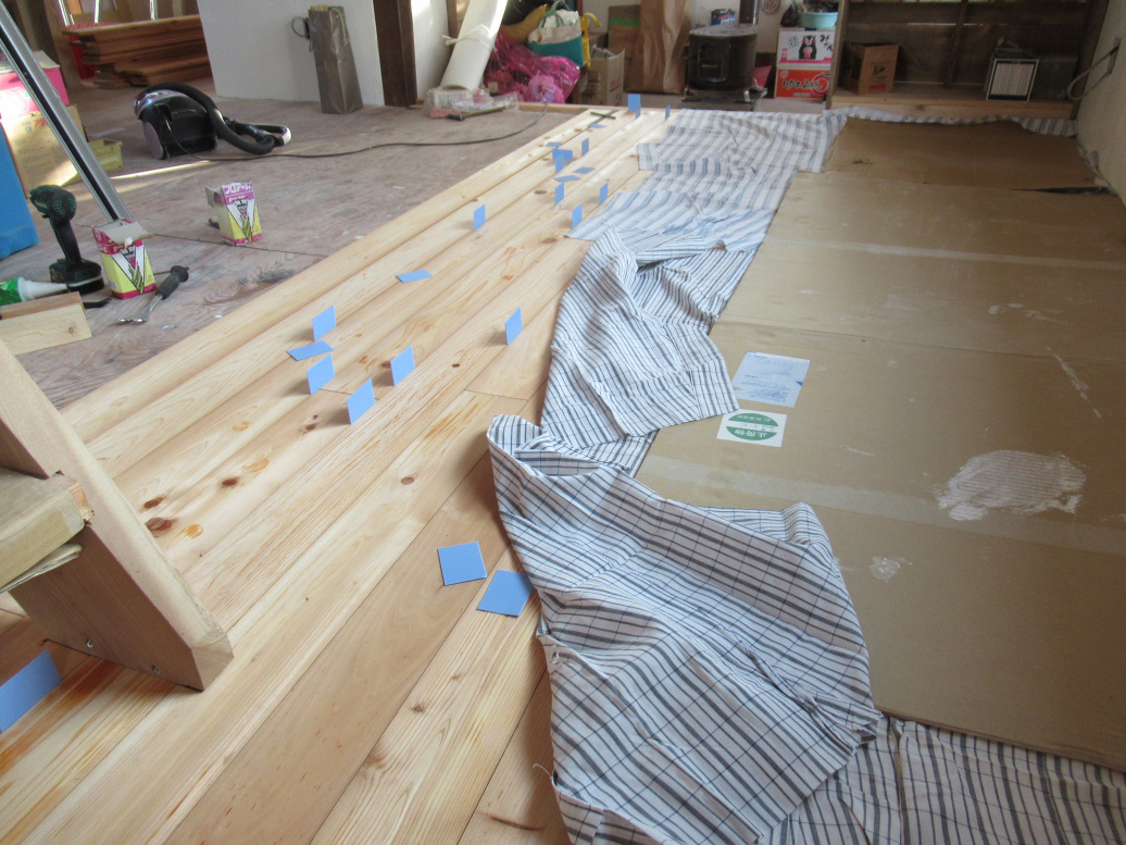 張り終えたところは、随時、養生しています。