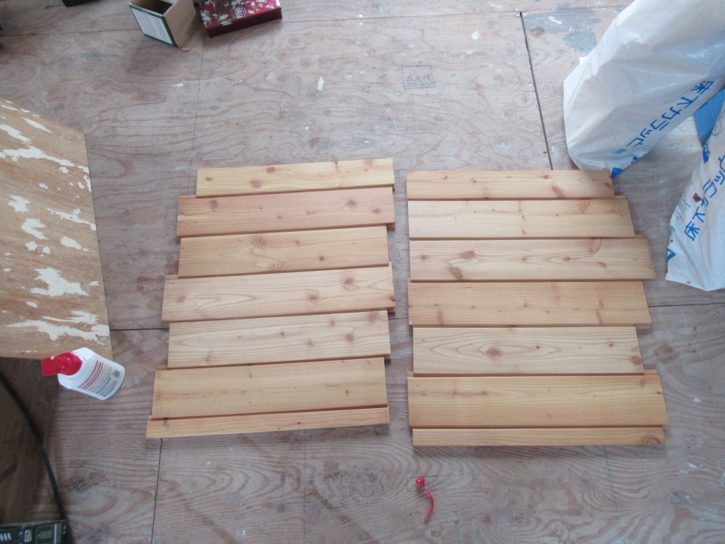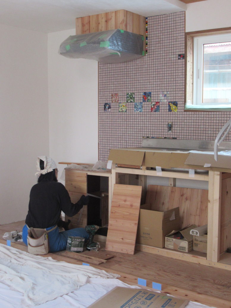 シンク下の開き戸の扉は、羽目板の端材を利用することに。